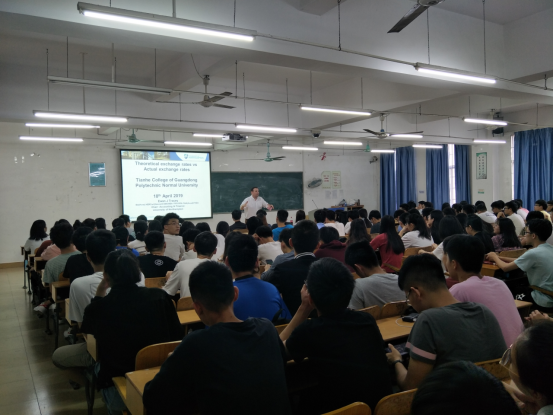 4月18日,英国北安普顿大学Ewan J Tracey来访我校,为全校学生带来一场以“理论汇率和实际汇率”为主题的讲座。
