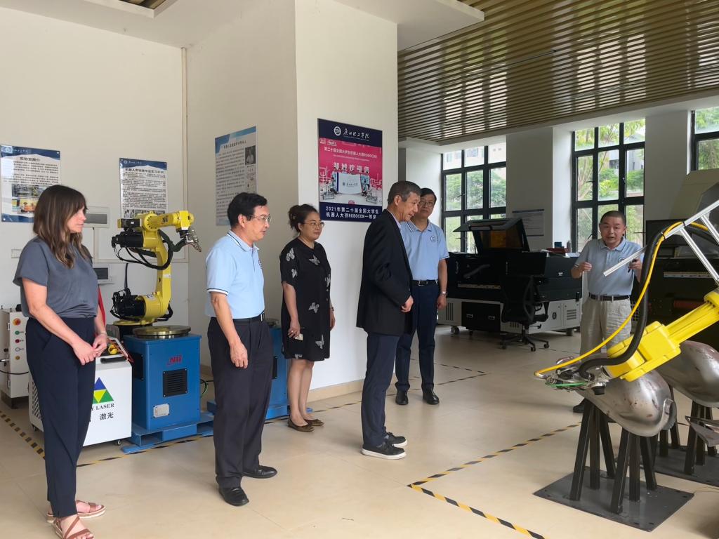 会谈结束后,黄南松、梁学宏陪同来访代表参观了工程楼人工智能研究所、新能源汽车工作坊。