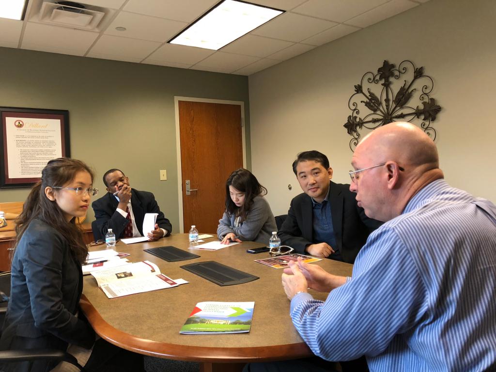 代表团与工商管理学院院长杰夫·斯坦波博士(Jeff Stambrough)见面。工商管理学院与当地商会联系密切,与当地的相关行业合作做项目,具有很强的实践性。天河学院和中西州立大学都是以培养应用型人才为目标,此类课程能让学生获益很多。斯坦波院长希望天河学院学生能够踊跃报读工商管理学院。